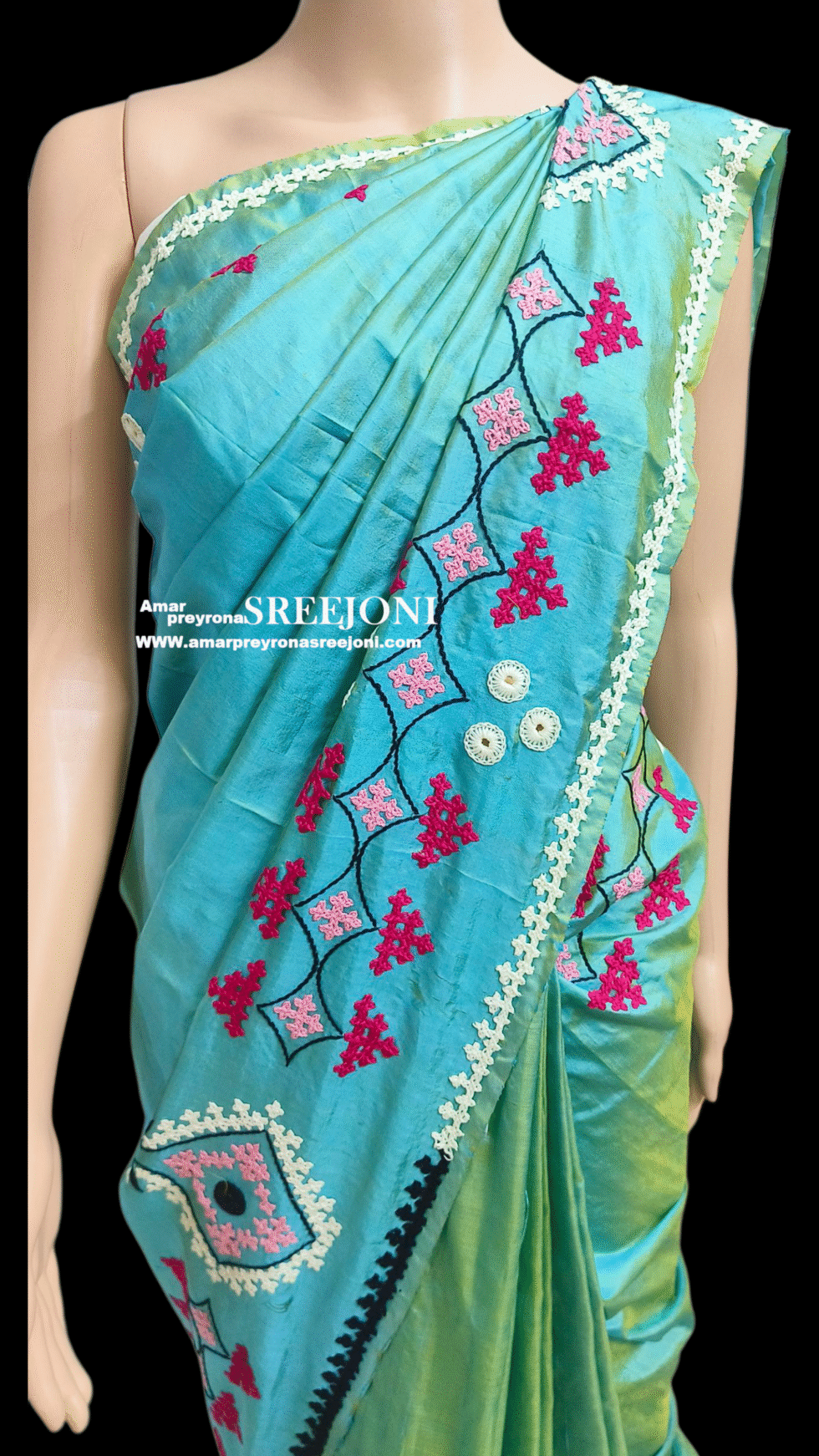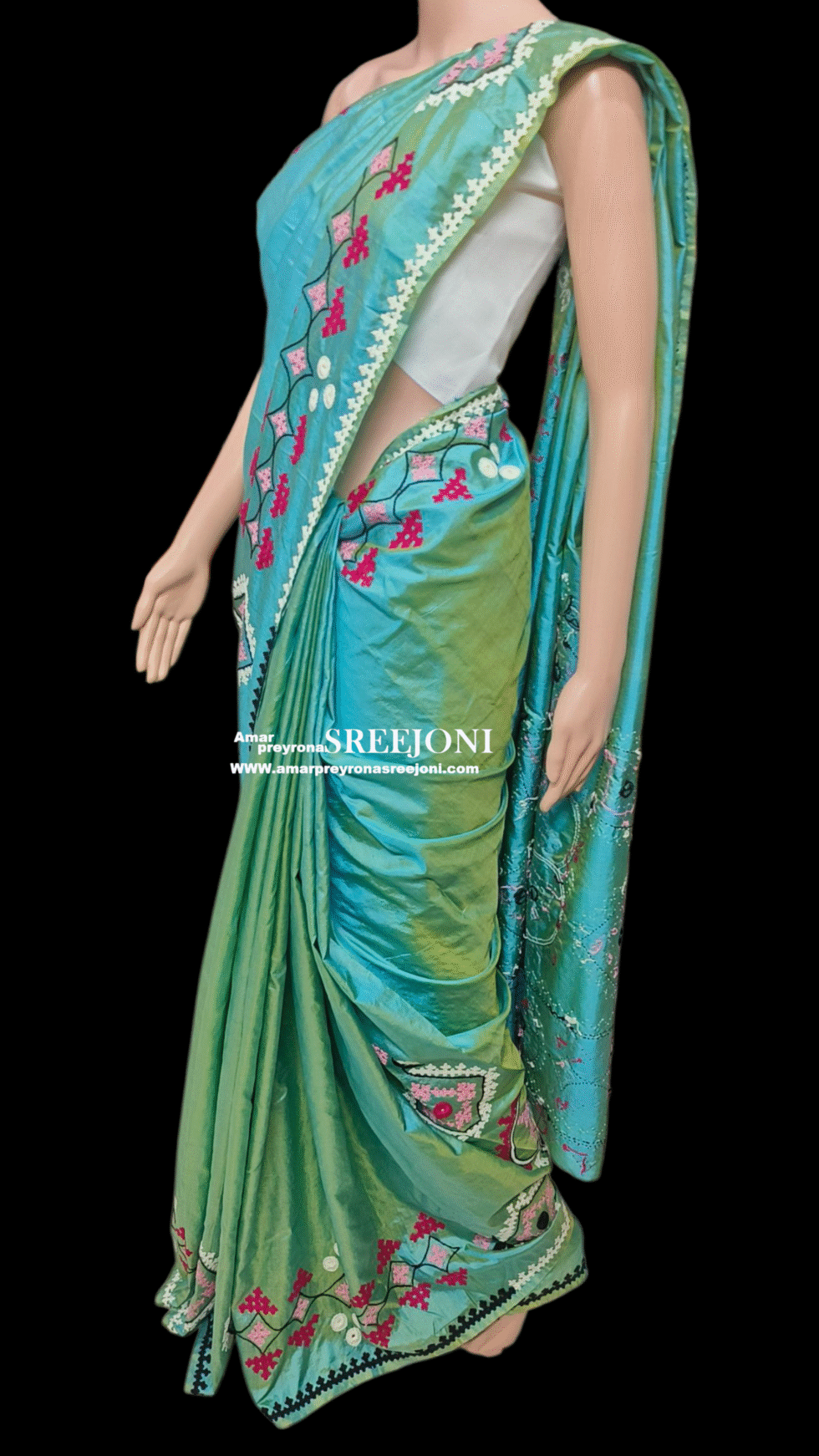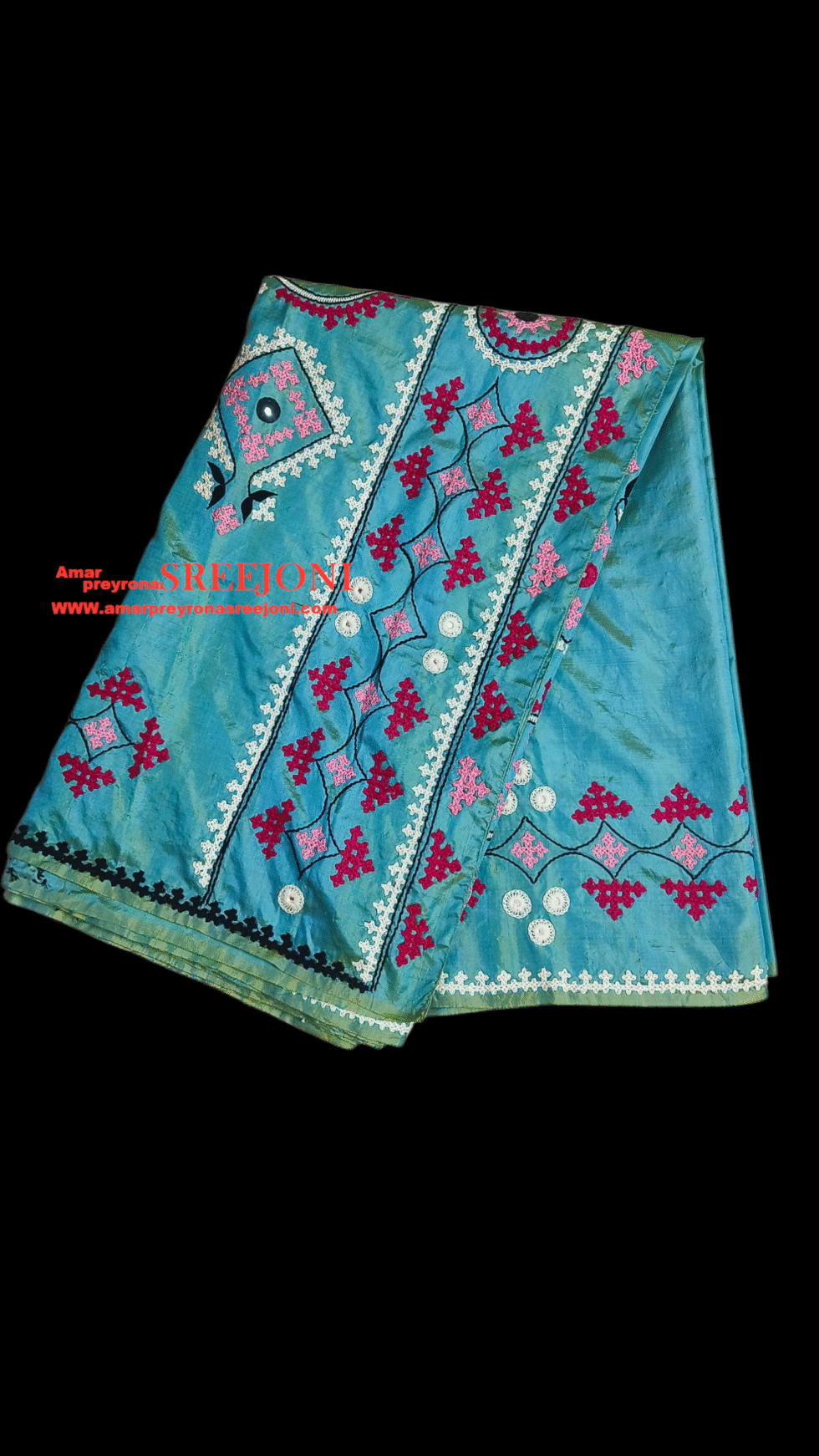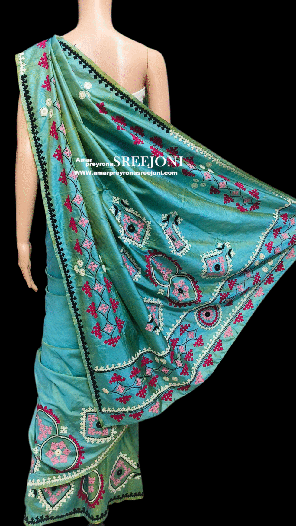 Gujrati Work Pure BishnuPuri Silk Hand Embroided DuelTone Saree Usable For Women And Girls