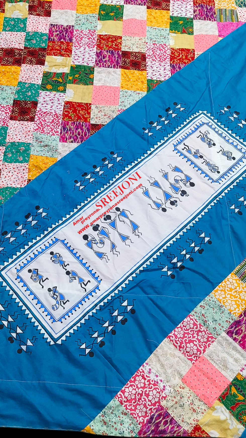 hand embroided and fabric work pure cotton both side usable double bed size multicolor long kantha
