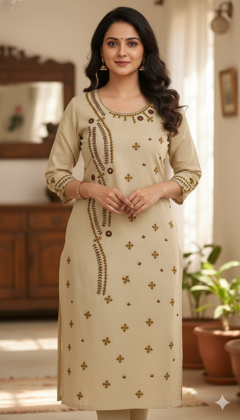 Enhance your ethnic wardrobe with this elegant Hand Embroidered Pure Cotton Beige Color Long Kurti Fabric. Crafted from premium-quality pure cotton, this fabric is soft, breathable, and gentle on the skin, making it perfect for daily wear as well as office and casual occasions.