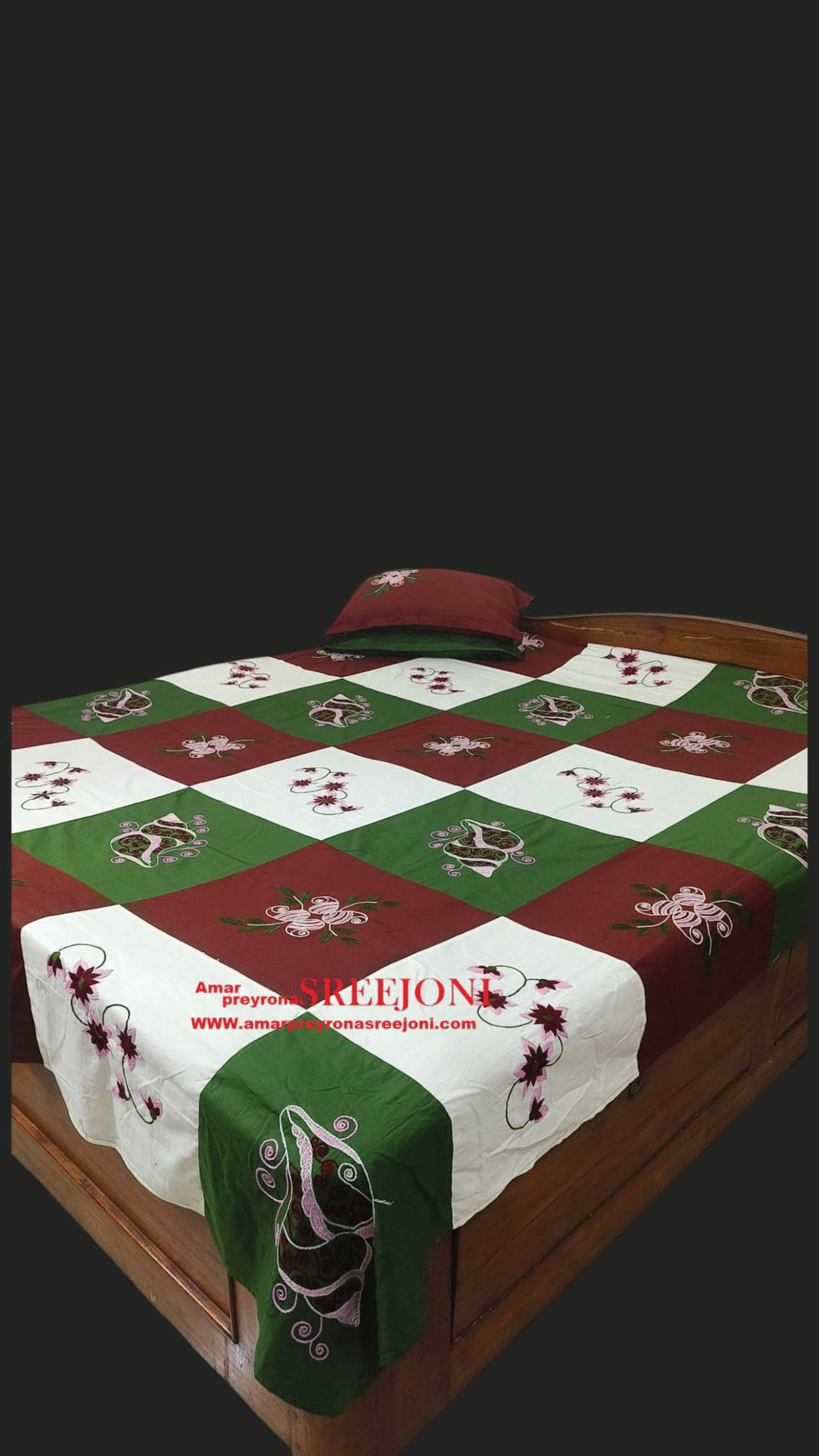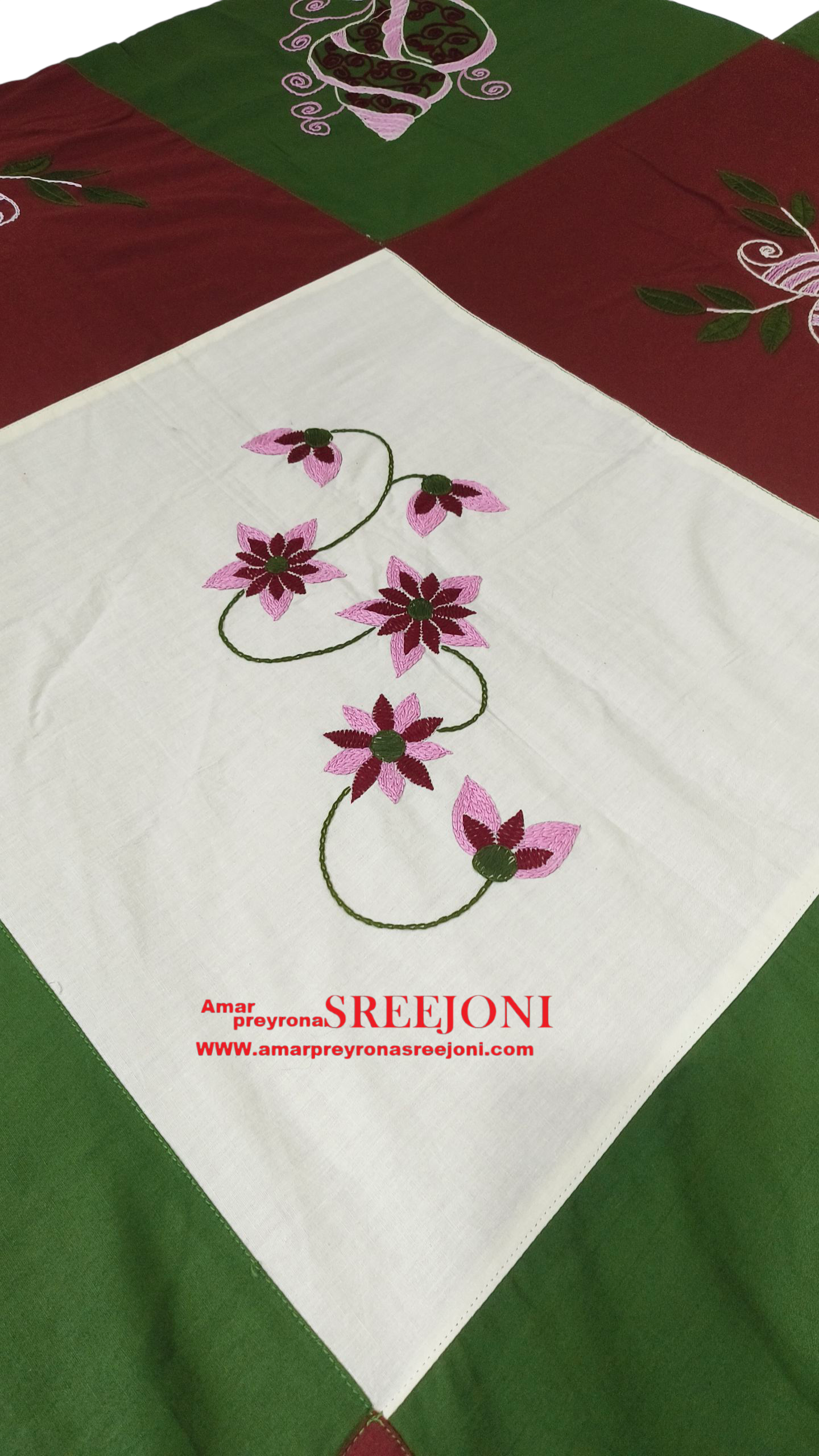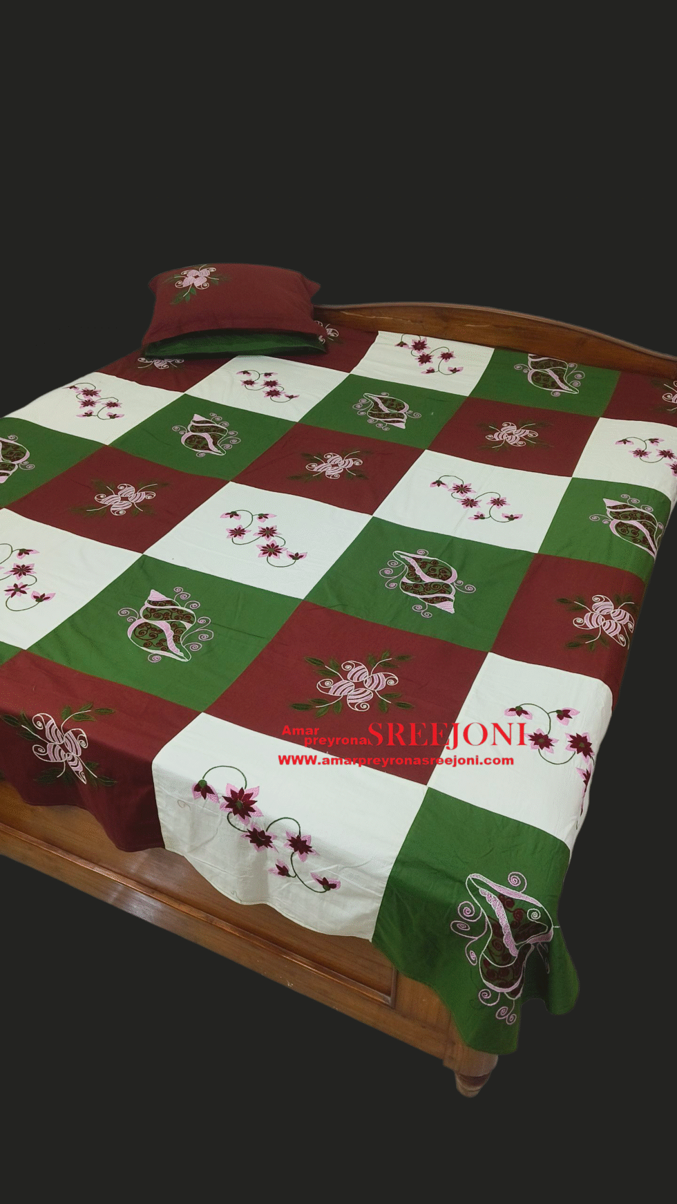 Hand embroided Pure Cotton Maroon, White, And Green Combination King Size Double Bed Sheet With 2pillow Cover