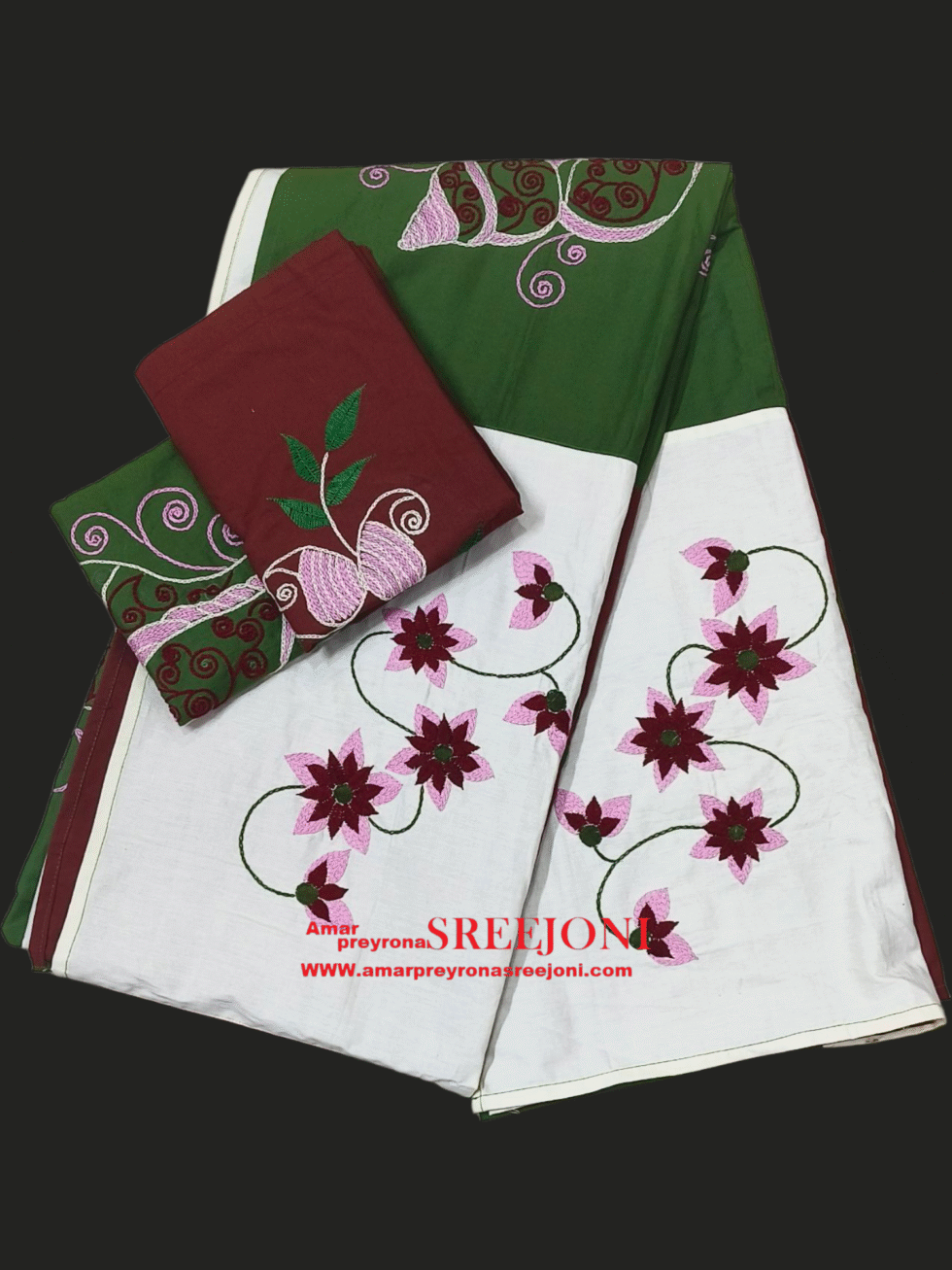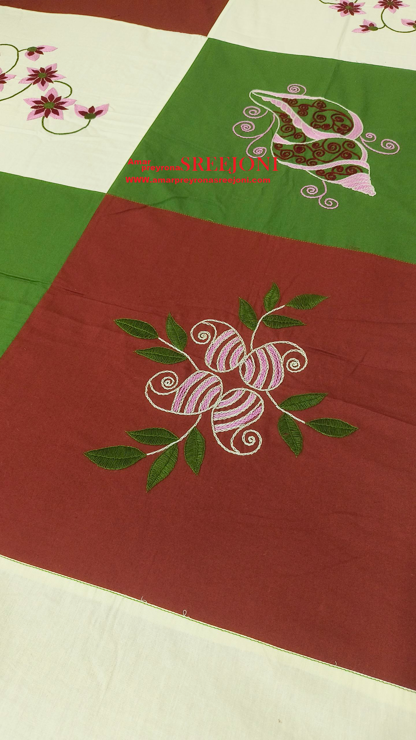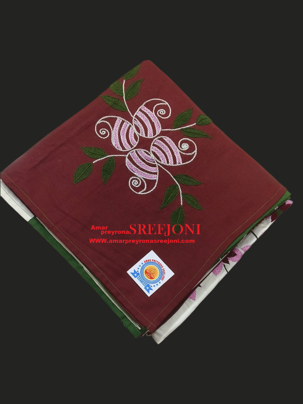 Hand embroided Pure Cotton Maroon, White, And Green Combination King Size Double Bed Sheet With 2pillow Cover