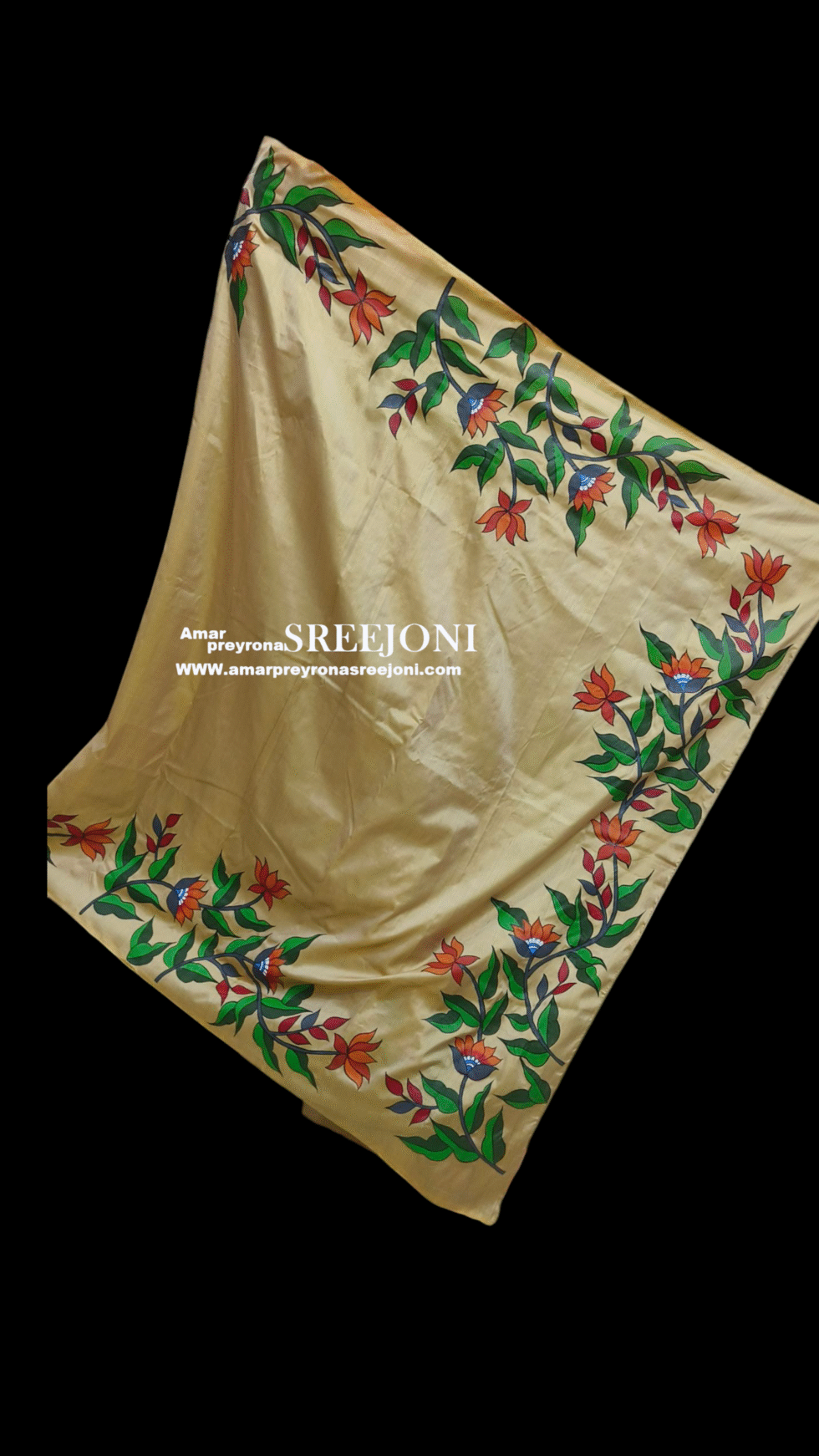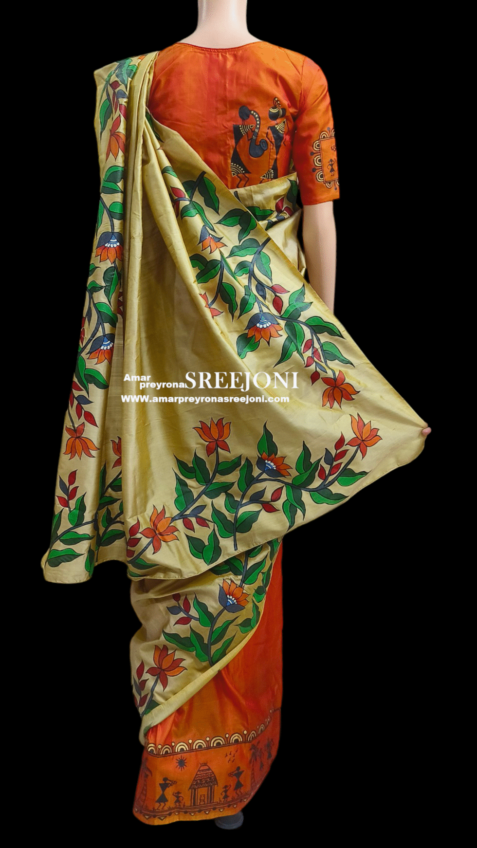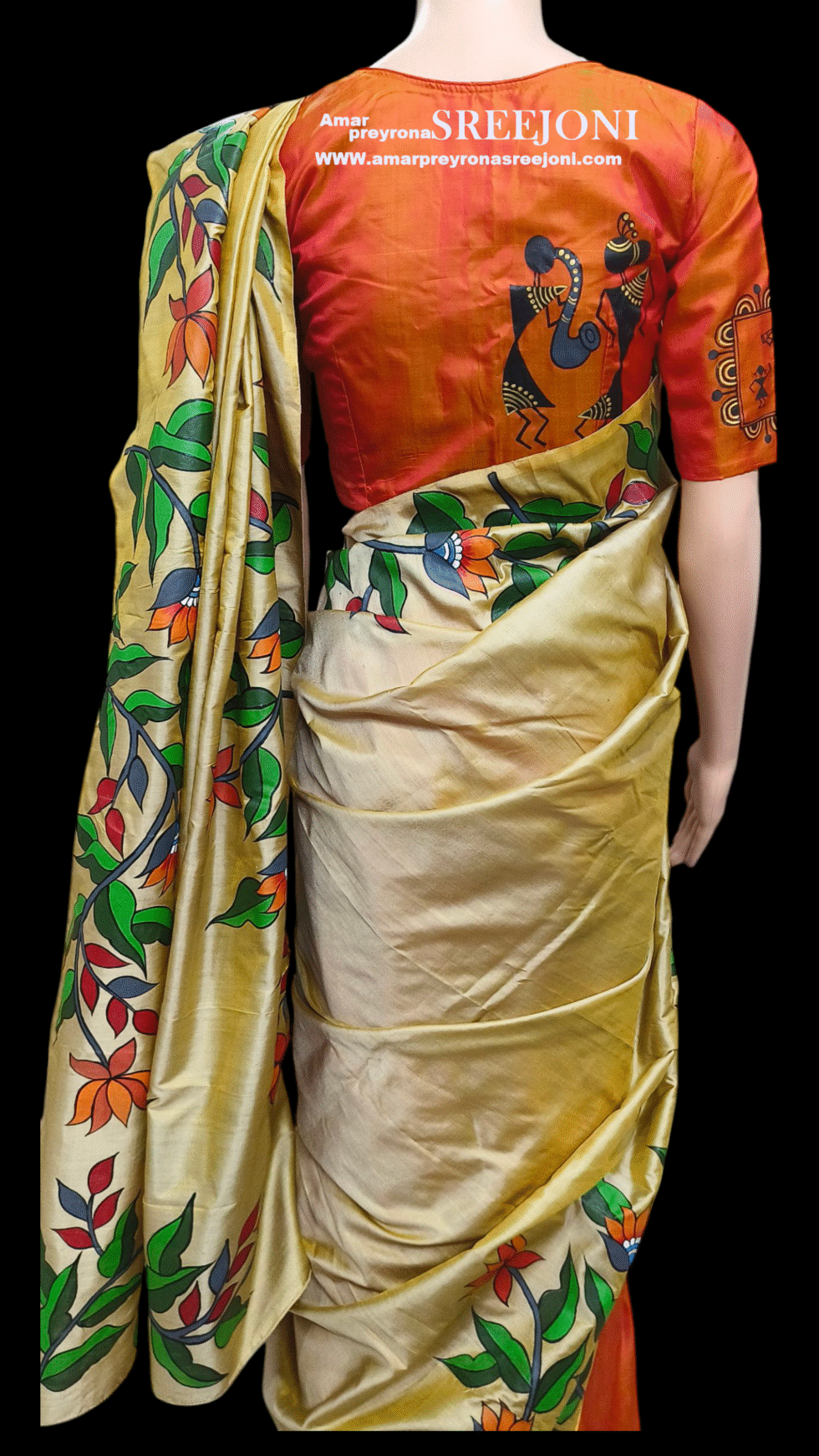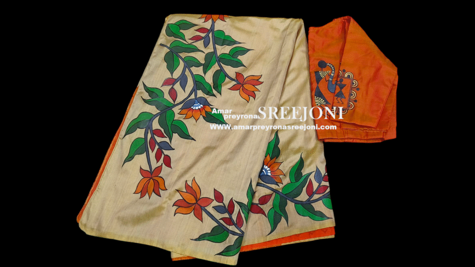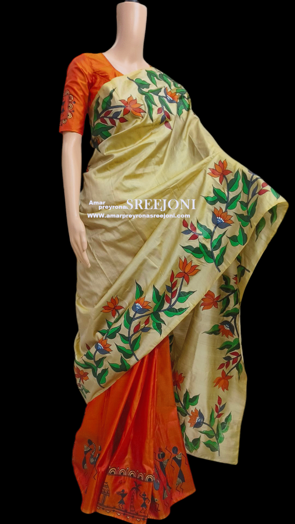 Hand Painted Pure Bishnupuri Silk Orange and Beige Color Combination Saree