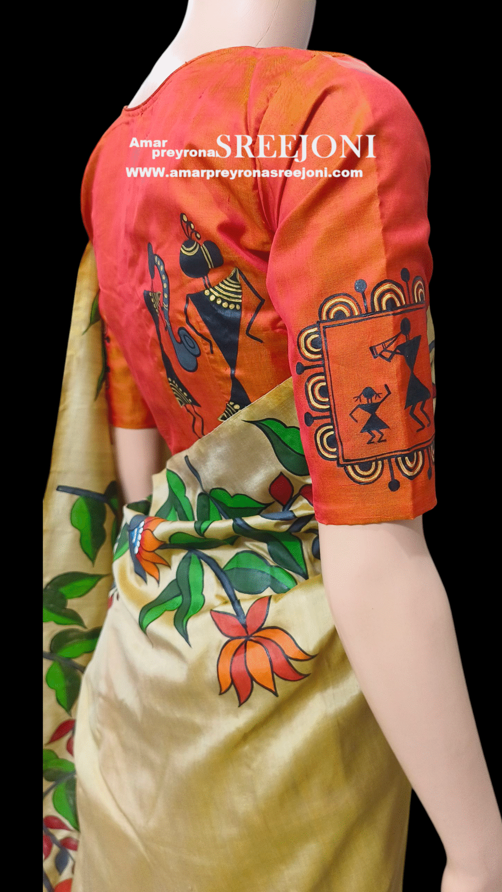 A graceful blend of tradition and artistry, this Hand Embroidered and Hand Painted Pure Bishnupuri Silk Saree showcases timeless elegance. Designed in a stunning orange and beige color combination, it reflects exquisite craftsmanship with delicate embroidery and artistic hand painting. Made from premium Bishnupuri silk, the saree drapes beautifully, making it perfect for festive occasions, weddings, and cultural celebrations.