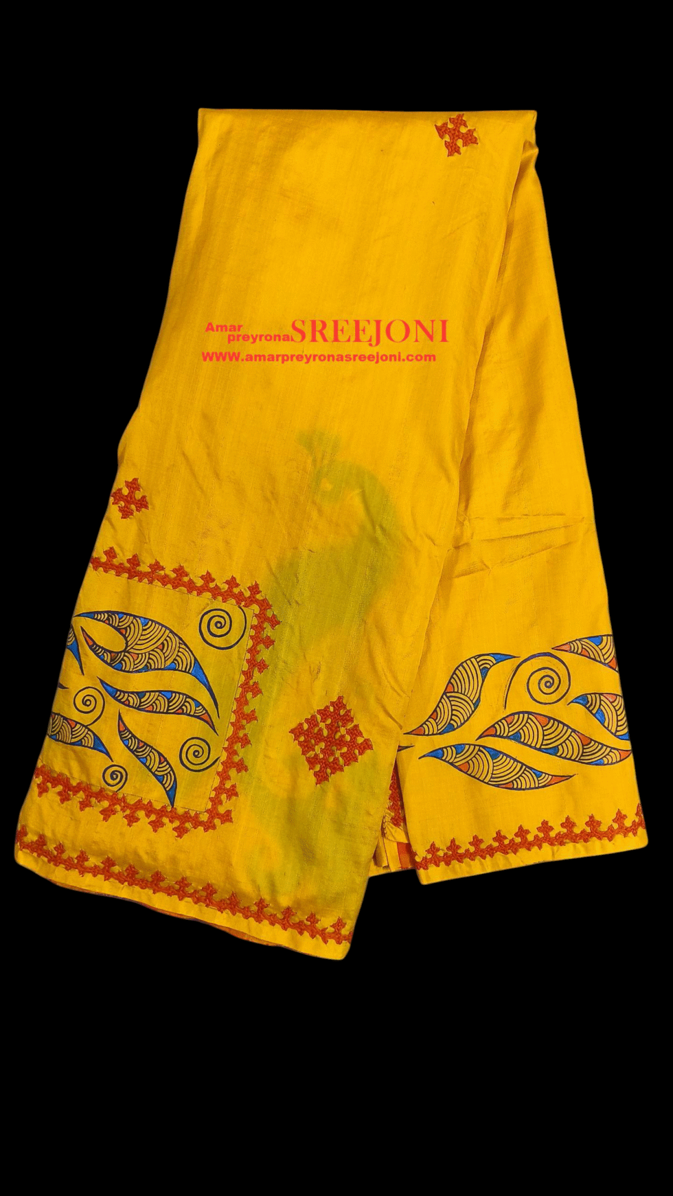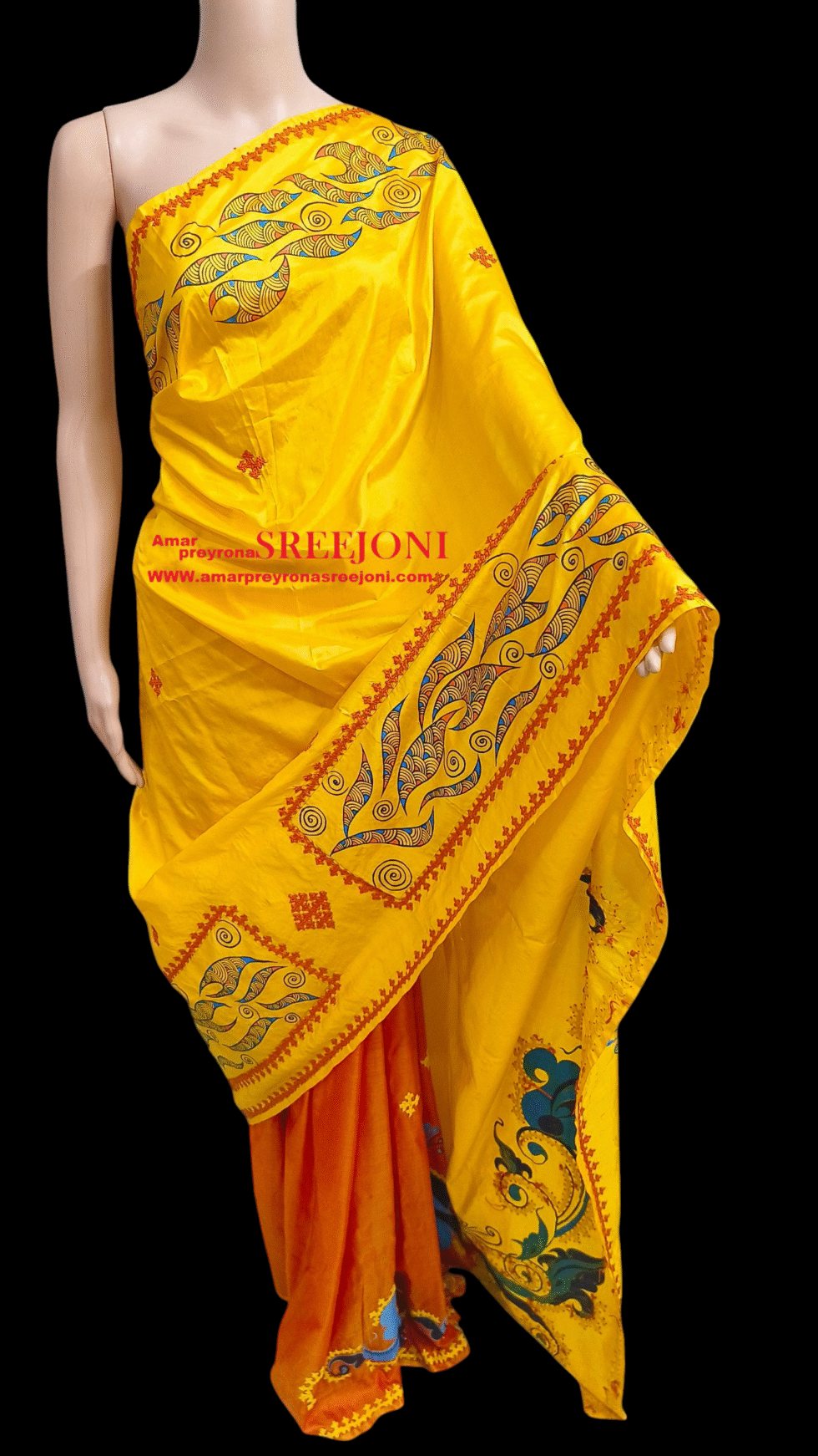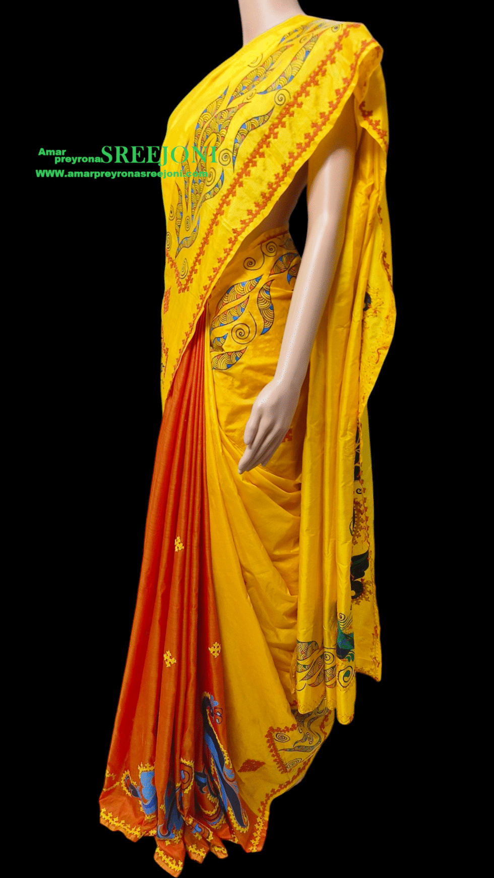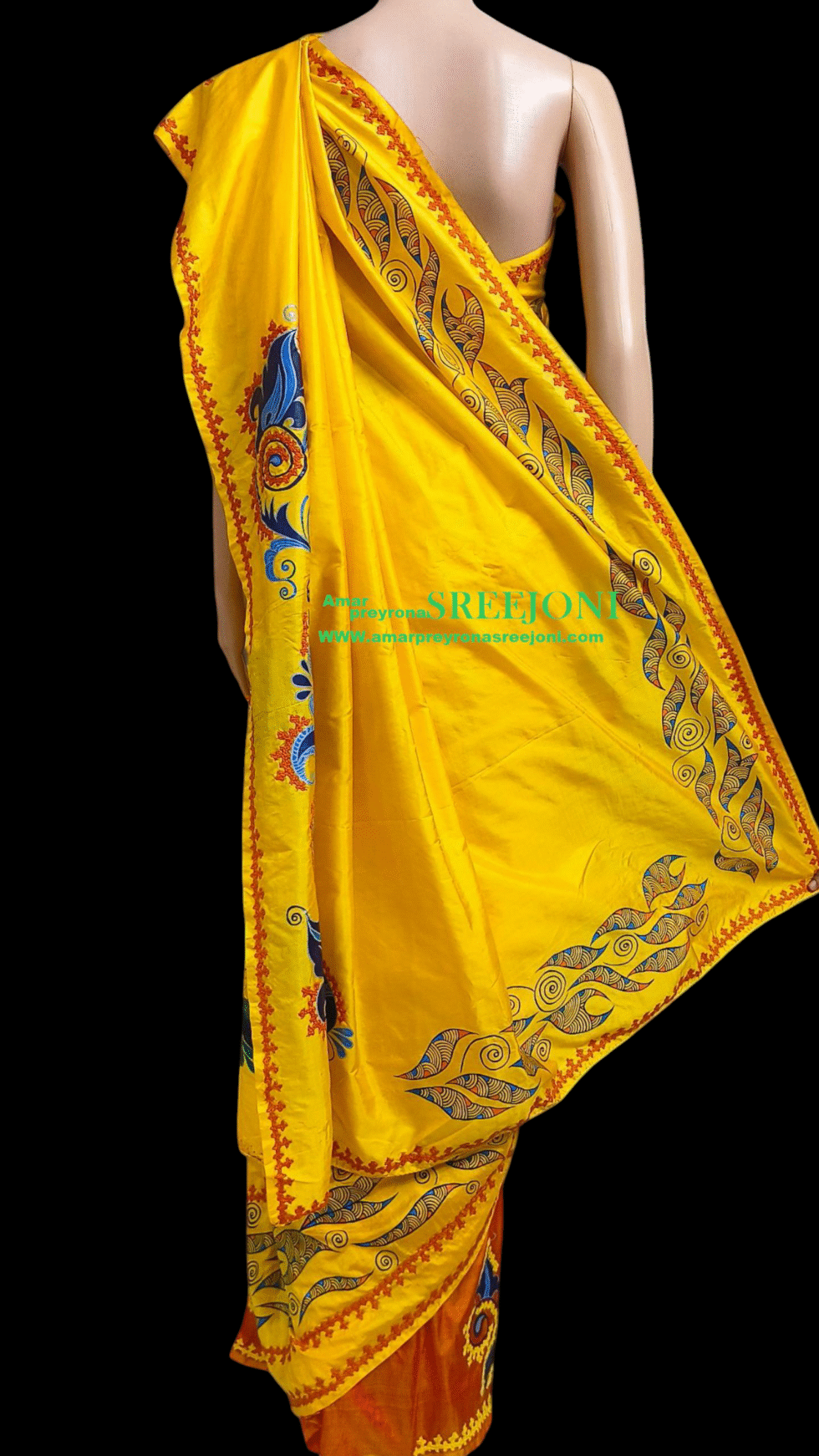Hand Embroidery And Hand Painted Pure Bishnupuri Silk Orange And Yellow Color Combination Saree