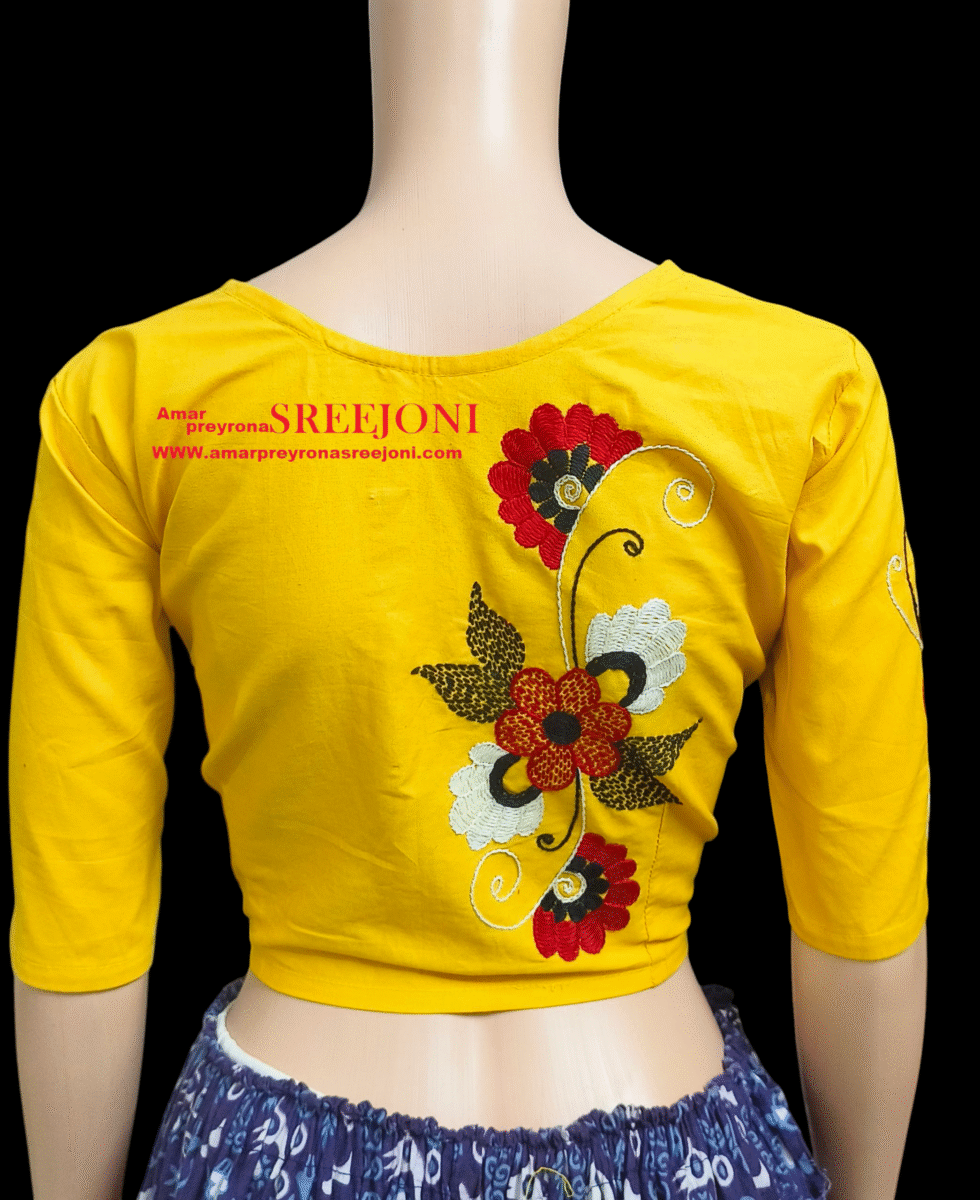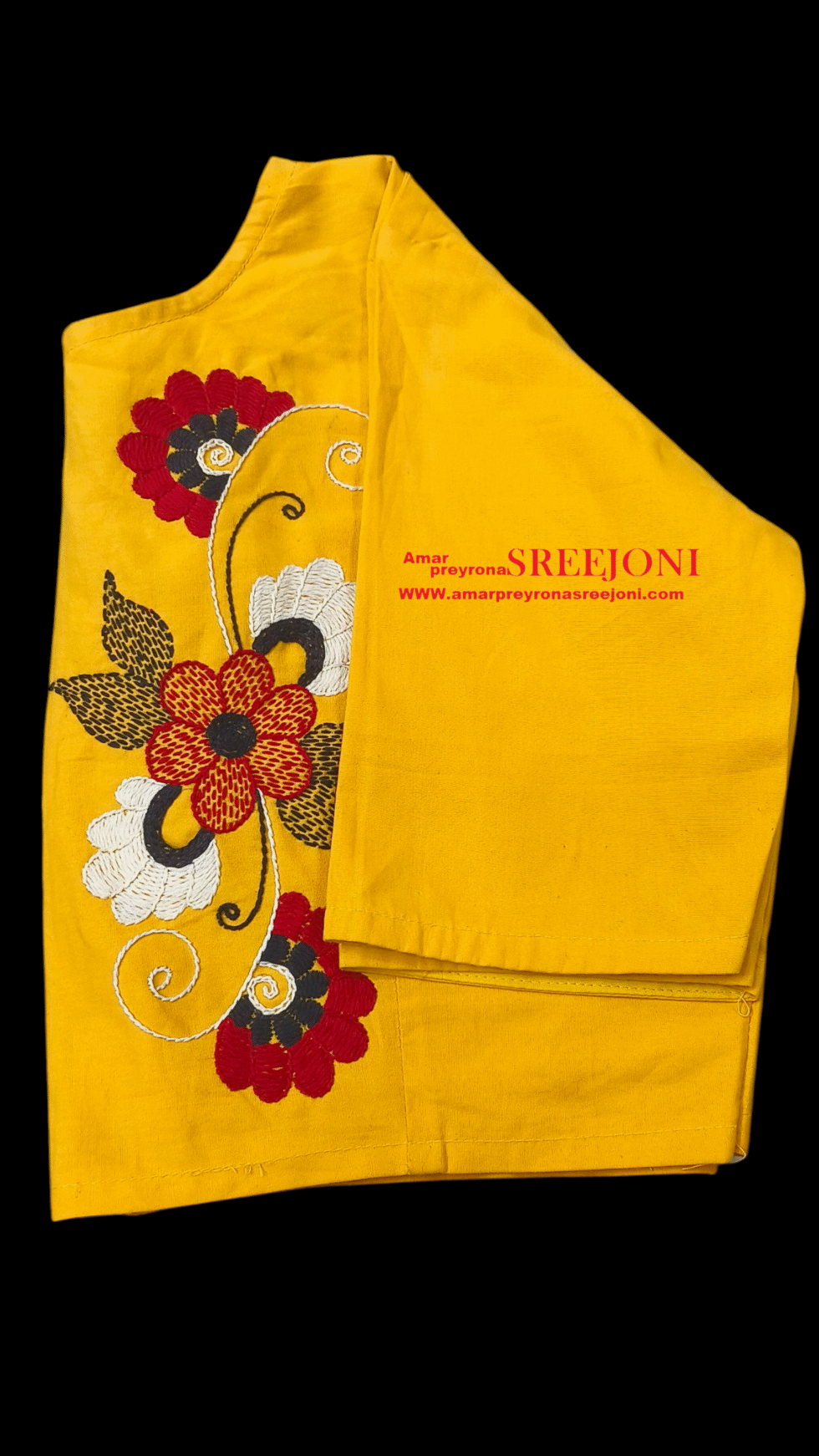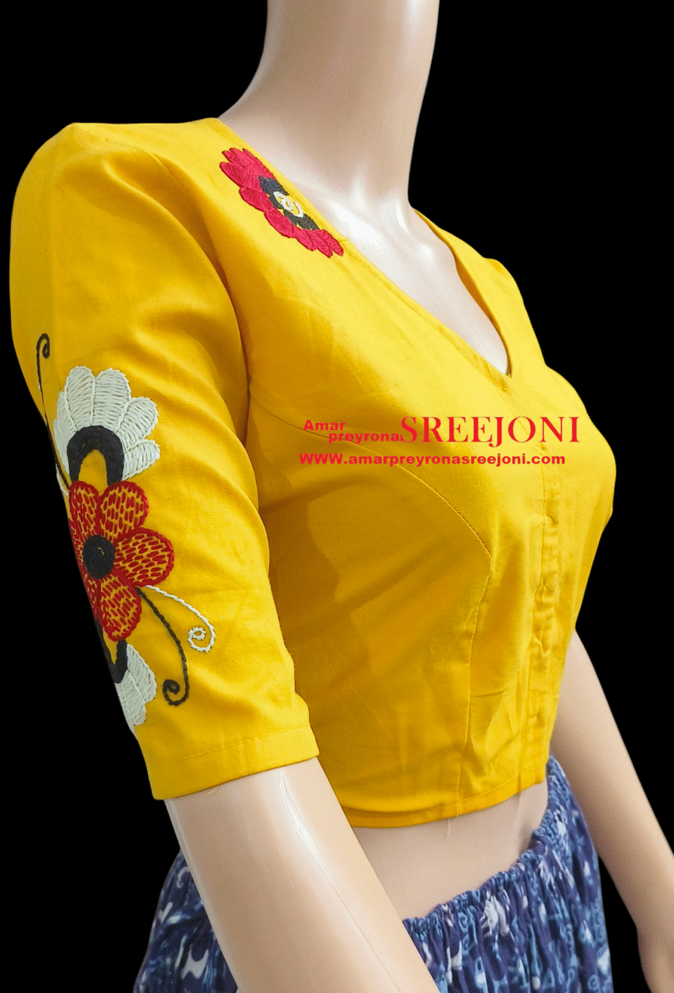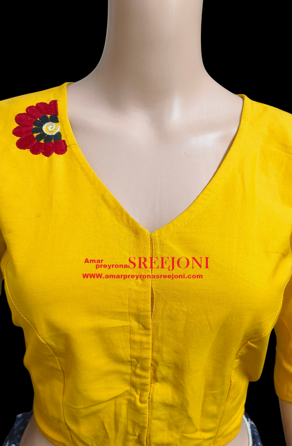 Enhance your ethnic wardrobe with this beautifully crafted Hand Embroidered Pure Cotton Yellow V-Neck Blouse. Designed with elegance and comfort in mind, this blouse features delicate hand embroidery on breathable pure cotton fabric, making it perfect for festive occasions, casual wear, or traditional gatherings. The vibrant yellow color adds a bright, cheerful touch, while the V-neck design brings a stylish and graceful look.
